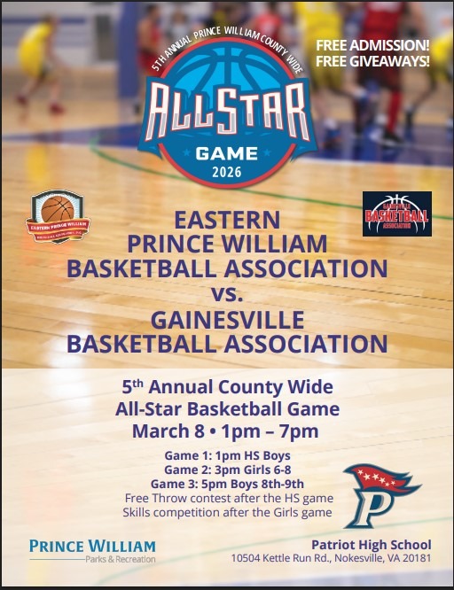 Prince William County Dept. of Parks, Recreation, and Tourism will be conducting its 5th annual County-Wide All-Star Basketball Event. Youth basketball participants from Eastern Prince William Basketball and Gainesville Basketball Association will compete in this East vs. West showcase of 3 separate games. All-Star participants from middle and high school divisions will be selected by each league to compete in this upcoming event.