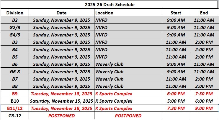 Please note the specifics for your division(s) and mark your calendar accordingly. Please do not request changes to the schedule. If you are unable to attend the draft for your division, you will need to make arrangements to have someone (spouse/neighbor/coach/friend/relative) draft your team on your behalf. Please send an email to the admin with the contact information of your substitute in case we need to reach them on the day of the draft.